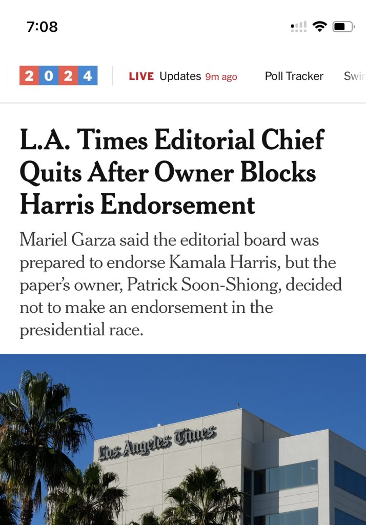 Says that the L A Times editorial board had agreed to endorse a candidate ( Harris it seems) in the 2024 presidential election